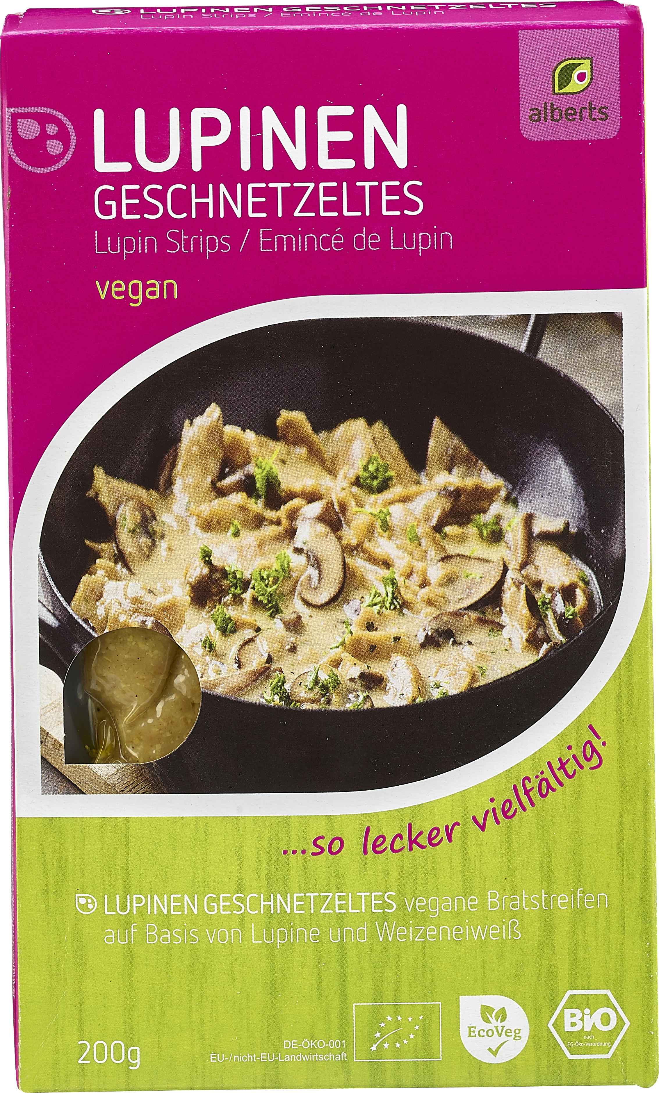 Lupinen Geschnetzeltes, vegan, 200 gr Packung, Alberts