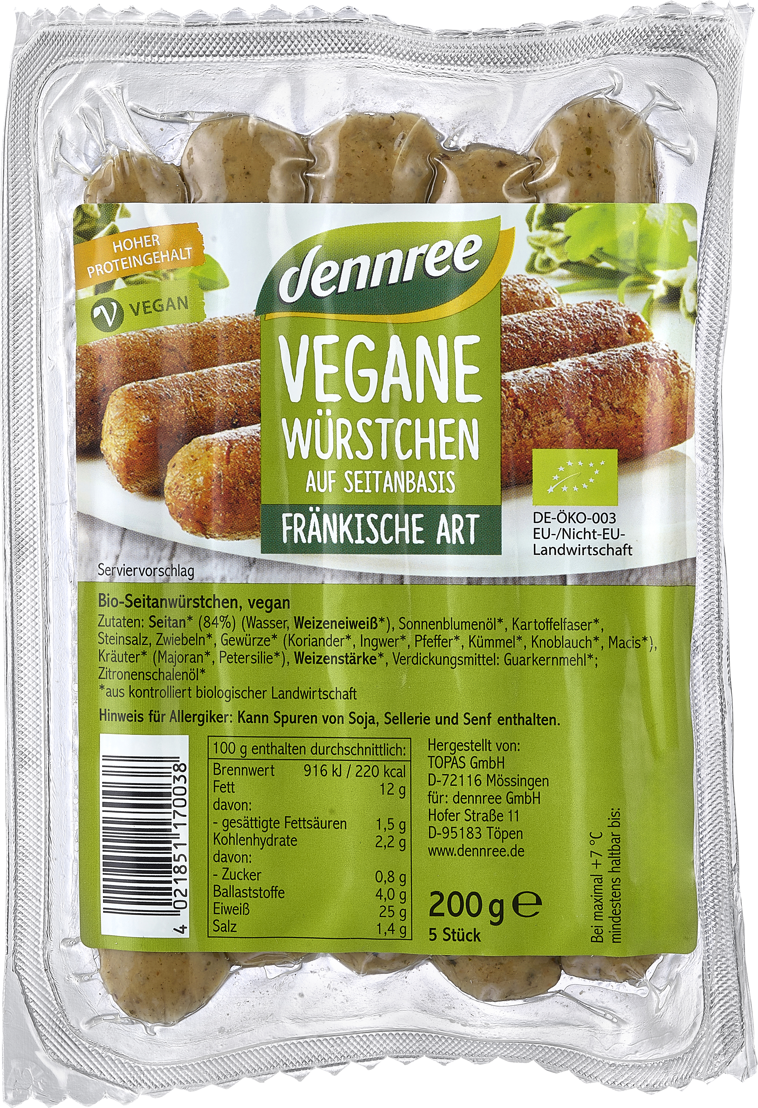 Vegane Würstchen „Fränkische Art” (auf Seitanbasis), 200 gr Packung (5 Stück), dennree